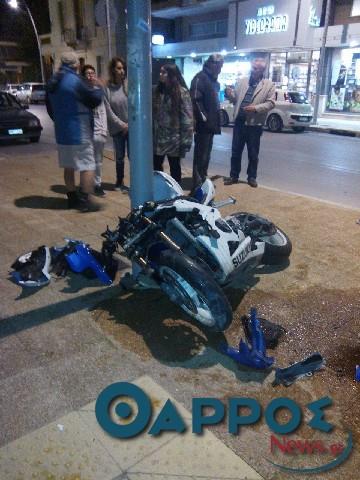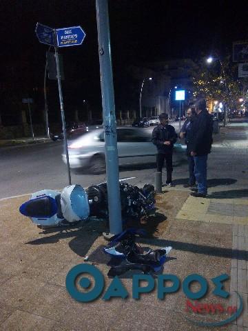 Μια μηχανή μεγάλου κυβισμού καρφώθηκε σε κολόνα, το βράδυ της Πέμπτης, στη διασταύρωση των οδών Φαρών και Πραξιτέλους στην Καλαμάτα.