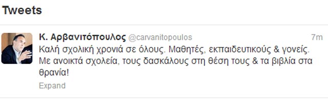 Καλή σχολική, «με ανοικτά σχολεία, τους δασκάλους στη θέση τους και τα βιβλία στα θρανία» έγραψε πριν από λίγο στο twitter ο υπουργός Παιδείας, Κωνσταντίνος Αρβανιτόπουλος...