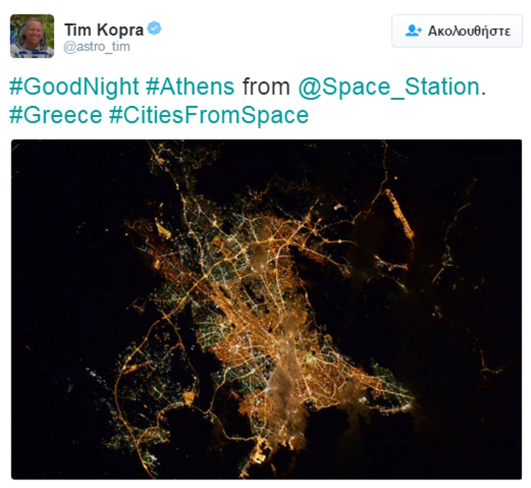 «Καληνύχτα Αθήνα από τον Διεθνή Διαστημικό Σταθμό» ήταν το μήνυμα του αστροναύτη της NASA στο Twitter, το οποίο συνοδευόταν από την φωτογραφία στην οποία διακρίνεται η ελληνική πρωτεύουσα τη νύχτα.
