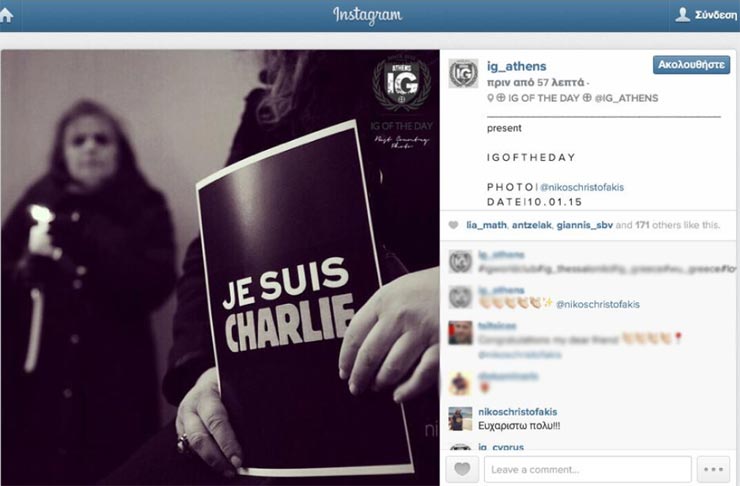 Η φωτογραφία που έκανε θραύση στα social media και φιλοξενήθηκε στο zougla.gr, την ημέρα της συγκέντρωσης αλληλεγγύης στη μνήμη των θυμάτων του Charlie Hebdo έξω από το γαλλικό ινστιτούτο, επιλέχθηκε ως photo of the day (σ.σ. φωτογραφία της ημέρας) από το Instagram για την Ελλάδα.