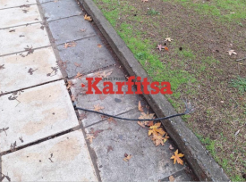 Συγκεκριμένα, στο πεζοδρόμιο της οδού Εθνικής Αμύνης, λίγο πριν από το νοσοκομείο Γεννηματάς, οι περαστικοί βλέπουν ένα γυμνό καλώδιο να προβάλει ανάμεσα από τις πλάκες.