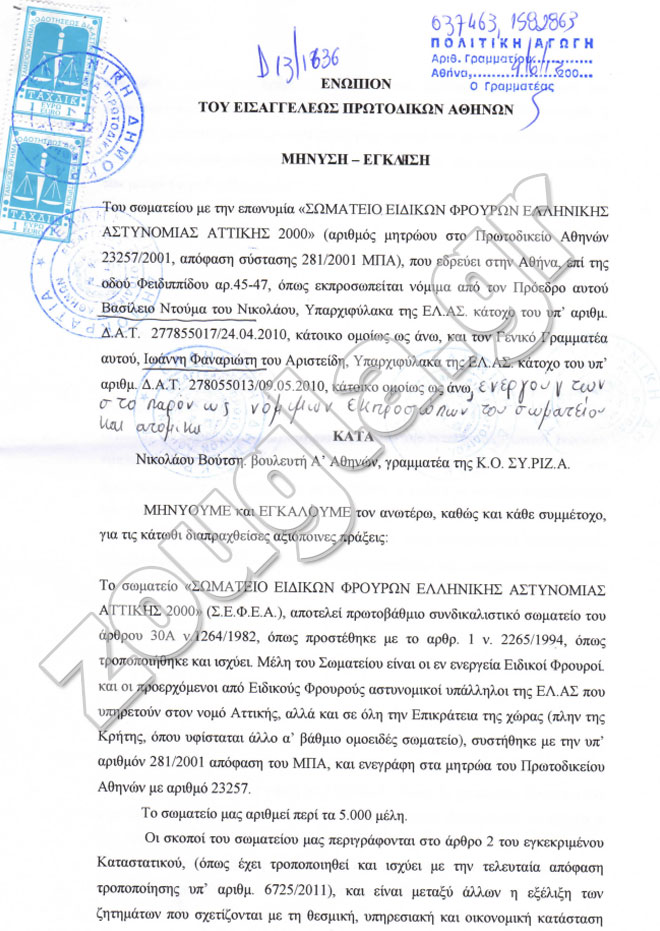 Όπως αναφέρουν οι ειδικοί φρουροί στη μήνυσή τους, η οποία βρίσκεται στη διάθεση του zougla.gr, «η δήλωση του μηνυομένου βουλευτή με αυτό το περιεχόμενο αποτελεί εξύβριση για το σύνολο των Ειδικών Φρουρών και Ελλήνων αστυνομικών, που εκτελούν το καθήκον τους. Τούτο διότι μετήλθε την εντελώς απαξιωτική έκφραση “μπάτσος”, η οποία χρησιμοποιείται κατά κόρον για να προσβάλλει την προσωπικότητα των αστυνομικών, να απαξιώσει τον ρόλο τους και την υπηρεσία τους και για να τους συνδέσει με ιδέες, πρακτικές και νοοτροπίες αντίθετες με τη δημοκρατική Πολιτεία. Παράλληλα, εξομοιώνει τους συναδέλφους αστυνομικούς («μπάτσους» κατά τη δήλωσή του) με τους “μπράβους” και “οτιδήποτε κυκλοφορεί στη χώρα”, υπονοώντας προφανώς φασιστικά, έκνομα και άλλα ακραία στοιχεία που δρουν με παράνομες μεθόδους και επιβάλλονται διά της βίας. Καμία μεταγενέστερη τάχα διευκρινιστική δήλωση του μηνυομένου σε τηλεοπτικές του εμφανίσεις περί αναφοράς του σε “επίορκους αστυνομικούς- νταβατζήδες” ή σε “απομονωμένη φράση” δεν είναι ικανή να άρει την προσβολή αυτή, αφού η επίμαχη λέξη “μπάτσοι” έχει τεθεί παραθετικά με τους μπράβους ή τις άλλες απαξιωτικές κατηγορίες ανθρώπων με τους οποίους μας εξομοίωσε».
