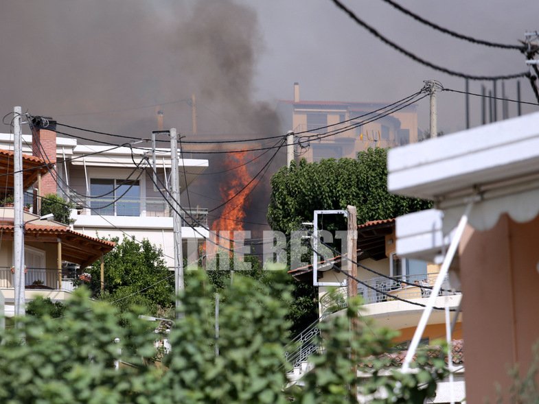 ρίψεις νερού πάνω από το πύρινο μέτωπο στη Δροσιά, όπου, σύμφωνα με την Πυροσβεστική, η εικόνα της φωτιάς είναι βελτιωμένη.
