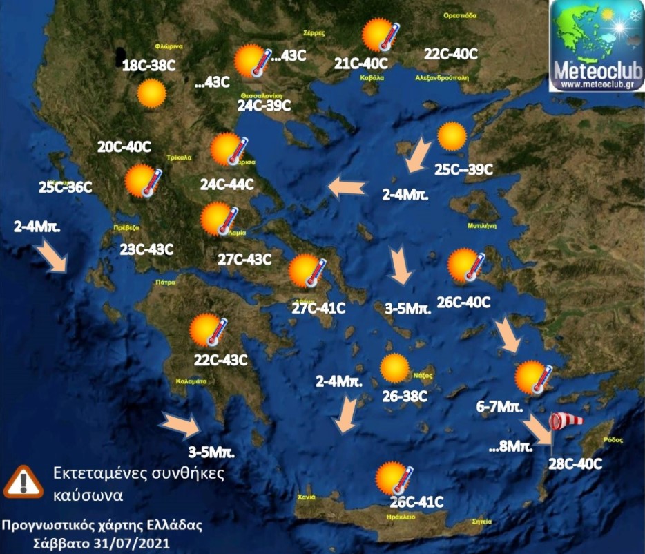 Καιρός: Γενικά αίθριος, με τοπικές νεφώσεις τις απογευματινές ώρες στα ορεινά της ανατολικής Μακεδονίας και της Θράκης. Άνεμοι: Μεταβλητοί 2 με 4 μποφόρ. Θερμοκρασία: Από 23 έως 41 και κατά τόπους στην κεντρική Μακεδονία έως 42 με 43 βαθμούς Κελσίου.