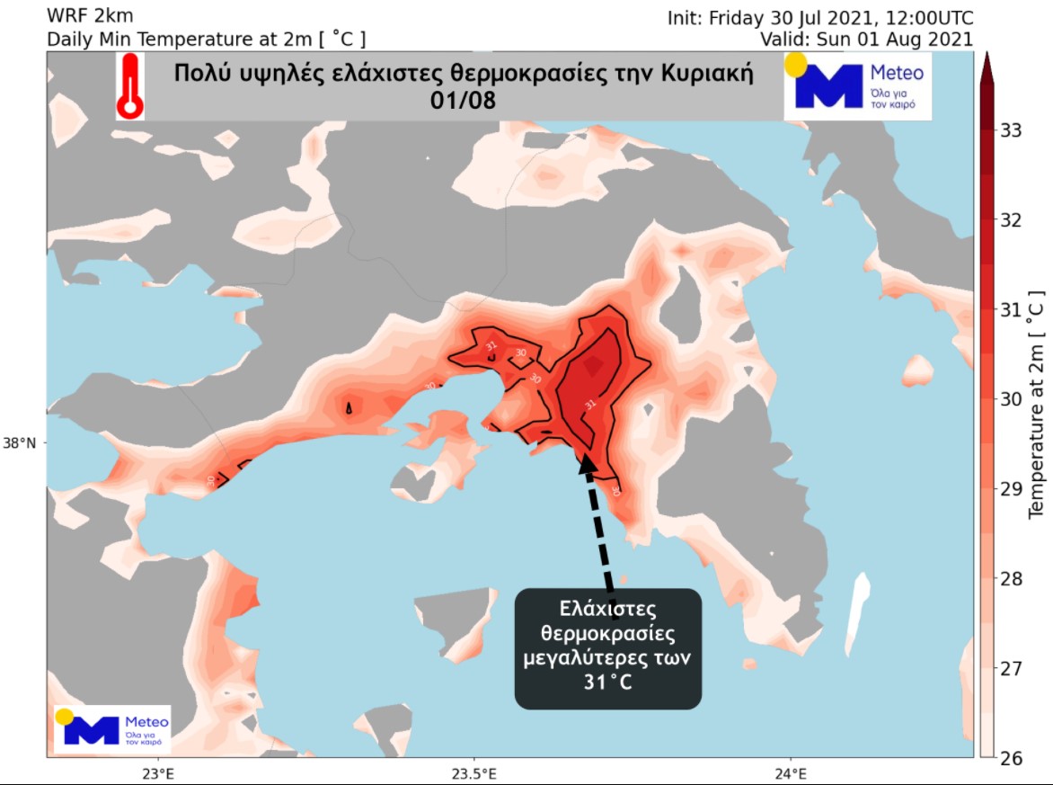 Καθώς το κύμα καύσωνα επιμένει, ιδιαίτερα θερμά καθίστανται τα αστικά κέντρα κατά τη διάρκεια της νύχτας, τόσο λόγω της μεγάλης θερμοχωρητικότητας των υλικών όσο και λόγω του φαινομένου της αστικής θερμικής νησίδας. Οι υψηλές ελάχιστες θερμοκρασίες οδηγούν στην αύξηση του αισθήματος δυσφορίας, προκαλώντας δυσμενείς συνθήκες για τους κατοίκους. Στον προγνωστικό χάρτη που ακολουθεί αποτυπώνονται οι ελάχιστες θερμοκρασίες για την Κυριακή 01/08, με τη θερμοκρασία εντός του αστικού ιστού της Αθήνας να διατηρείται στα επίπεδα των 31-33 βαθμών Κελσίου.