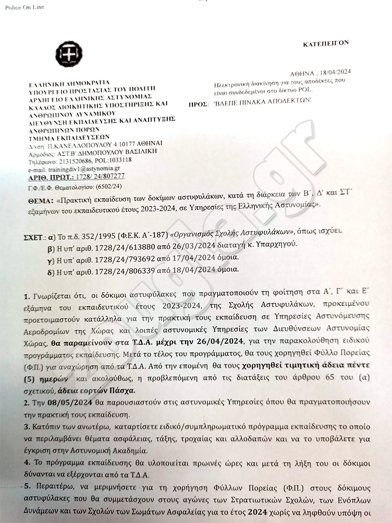 «Αναβρασμός στην Ελληνική Αστυνομία! Στο στόχαστρο αυτή τη φορά οι Δόκιμοι Αστυφύλακες. Μια ημέρα πριν αναχωρήσουν από τις Σχολές, περίπου 2.000 Δόκιμοι για πρακτική εκπαίδευση, στις Διευθύνσεις Αστυνομίας ανά τη χώρα, κάποιοι θυμήθηκαν να τους κρατήσουν μέσα για επιπλέον εκπαίδευση μιας εβδομάδας με αντικείμενο δήθεν την ασφάλεια των αεροδρομίων, και στη συνέχεια, αφού τους δώσουν τιμητική άδεια πέντε ημερών και την προβλεπόμενη άδεια εορτών Πάσχα, να τους ζητήσουν να παρουσιαστούν, στις 8/5/24, στον τελικό τους προορισμό! Και όλα αυτά, ενώ όλη η αστυνομία – από την Ηγεσία έως τον τελευταίο διοικητή – γνώριζε ότι η πρακτική εκπαίδευση θα διαρκούσε από τις 22 Απριλίου 2024 έως τις 17 Οκτωβρίου του 2024.