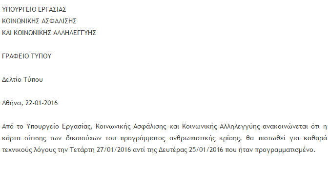 Την Τετάρτη 27 Ιανουαρίου καταβάλλεται στους τραπεζικούς λογαριασμούς των δικαιούχων -που έχουν επιλεγεί και συμμετέχουν στο πρόγραμμα ανθρωπιστικής κρίσης- τα ποσά που τους αναλογούν.