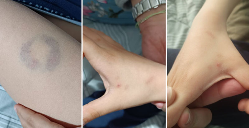 Η ίδια μου απάντησε ότι τα συγκεκριμένα τραύματα προκλήθηκαν από την προσπάθεια που έκανε η διευθύντρια και δασκάλα του σχολείου να απομακρύνει από κοντά της το παιδί μου, το οποίο της είχε πιάσει τα μαλλιά. Η έκπληξή μου συνεχίστηκε όταν έφτασα σπίτι μας και άλλαξα ρούχα στον γιο μου και πήγα να τον κάνω μπάνιο, όπου εκεί, κατεβάζοντας τη φόρμα του, είδα μια τεράστια μελανιά-δαγκωματιά στο μέσο του ποδιού του. Μάλιστα, πρόκειται για μελανιά (όπως βλέπετε και στις φωτογραφίες) όπου φαίνονται ίχνη δοντιών. Αυτό αμέσως με έκανε να καταλάβω ότι κάποιος δάγκωσε τον γιο μου δυνατά στο σημείο αυτό.