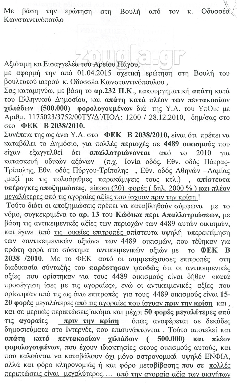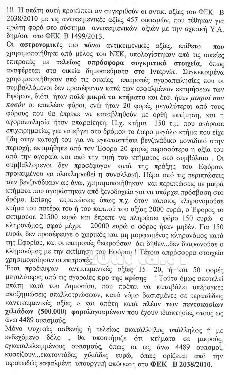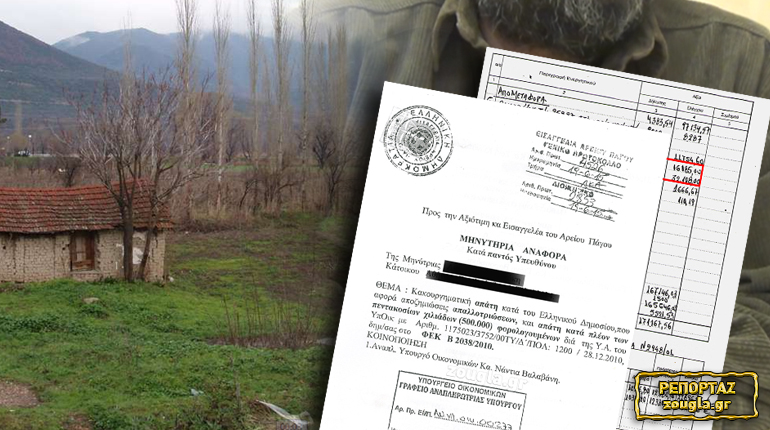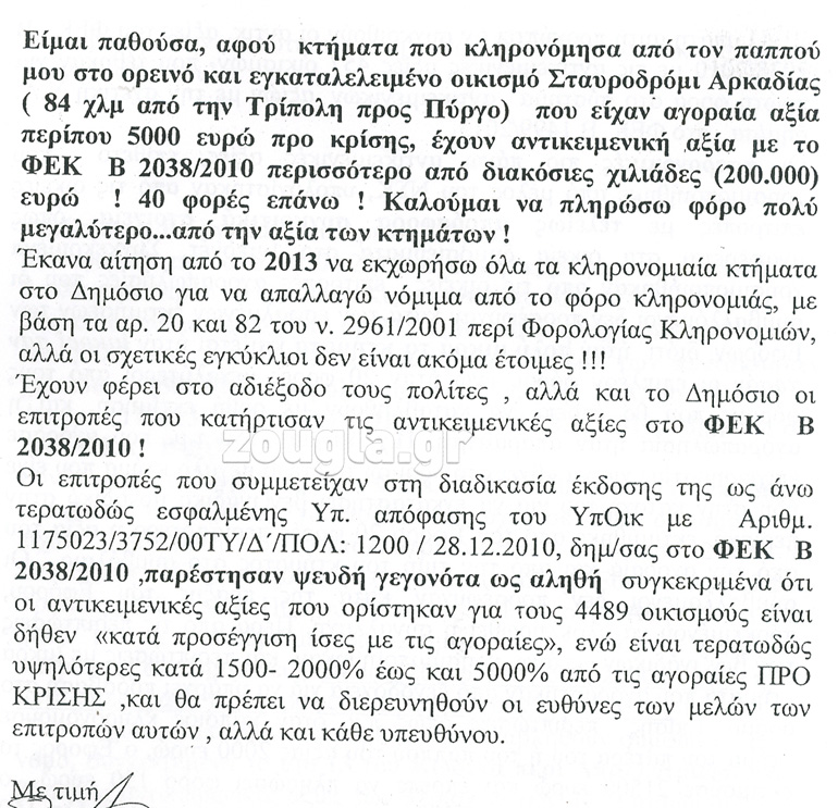 Ο Γ.Ρ. και η αδερφή του είναι ιδιοκτήτες ενός ακινήτου με πραγματική αξία που δεν ξεπερνά τα 6.000 ευρώ (τιμή προ κρίσης) και τους επιβλήθηκε φόρος… 46.000 ευρώ! Οι ίδιοι είναι οι πρώτοι που υπέβαλαν μηνυτήρια αναφορά προς την Εισαγγελία του Αρείου Πάγου (με κοινοποίηση στον πρωθυπουργό, στο Υπουργείο Οικονομικών, στη Βουλή και άλλα κυβερνητικά όργανα), στην οποία καταγγέλλουν «κακουργηματική απάτη κατά του Δημοσίου και κατά 500.000 φορολογουμένων».