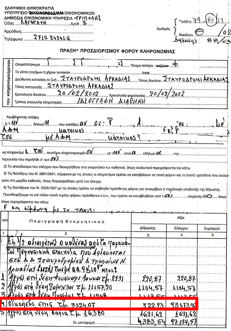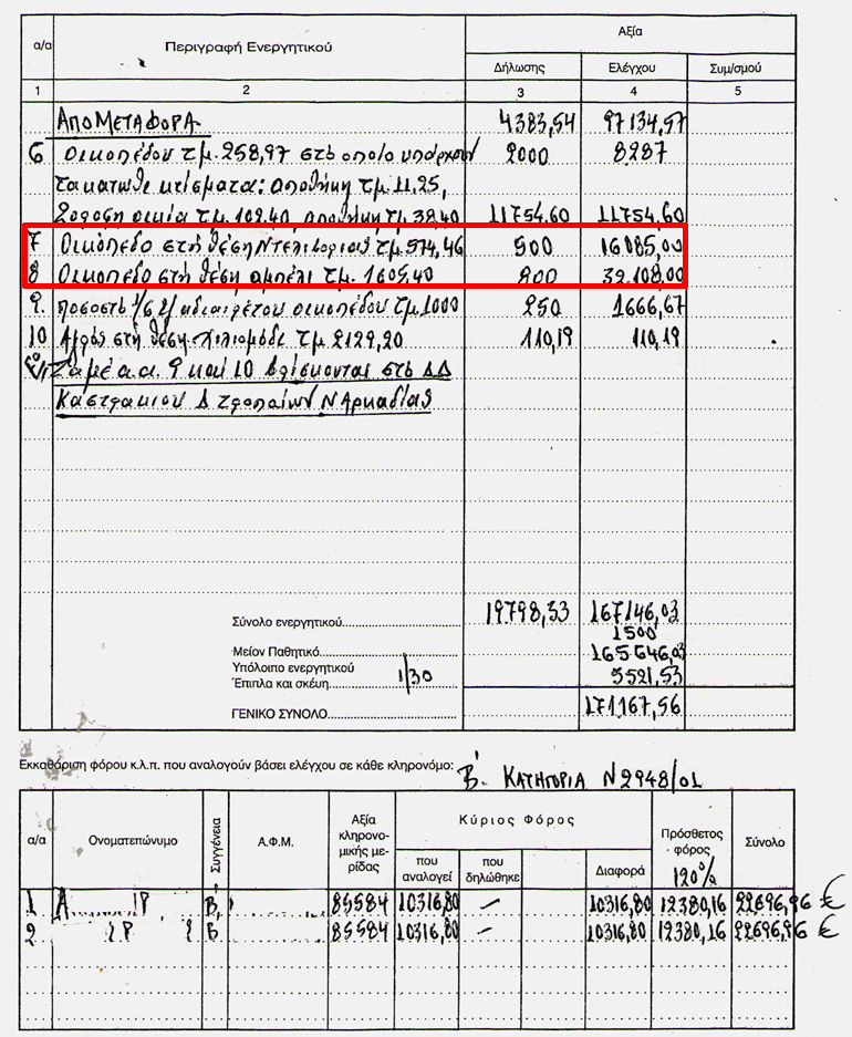 Στο κόκκινο πλαίσιο, η μεγάλη διαφορά μεταξύ της δηλωμένης αξίας του ακινήτου και της εκτίμησης των αρμοδίων, που είχε ως συνέπεια την επιβολή τεράστιου φόρου για… ένα κομμάτι αναξιοποίητης γης…