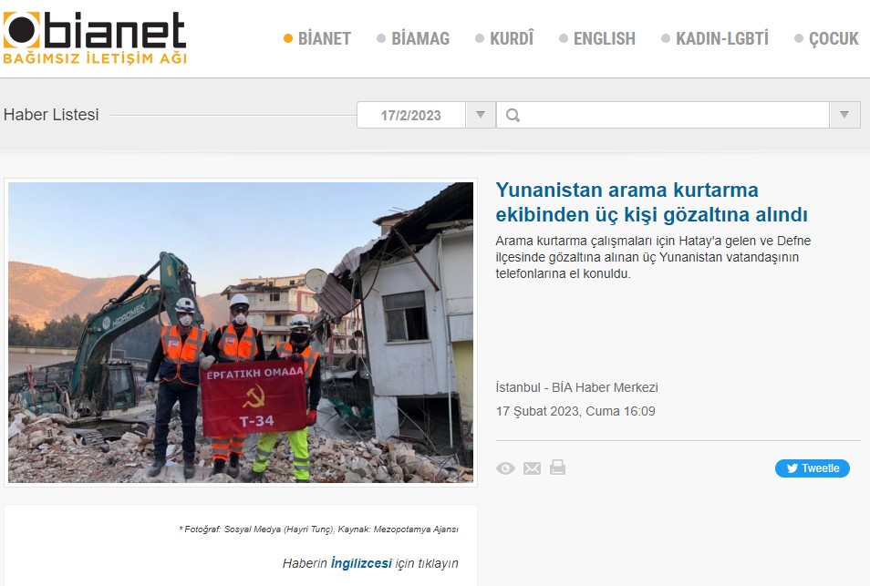 Η «Εργατική Ομάδα Τ-34» καταγγέλλει την προσαγωγή τριών Ελλήνων εθελοντών διασωστών από την Αντιτρομοκρατική Υπηρεσία της Τουρκίας, οι οποίοι είχαν πάει στο Χατάι για να βοηθήσουν τους σεισμόπληκτους.