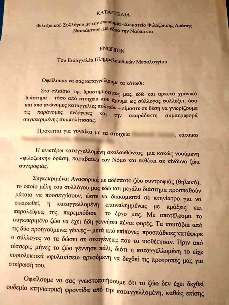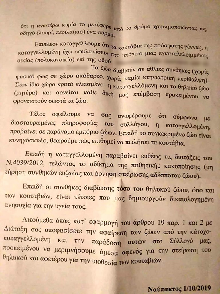 Σε μια σοβαρή καταγγελία έχει προβεί προς τον Εισαγγελέα η φιλοζωική οργάνωση «Φιλόζωοι Εθελοντές Ναυπάκτου», οι οποίοι αναφέρουν ότι μια συμπολίτισσά τους κρατάει υπό κακές συνθήκες ένα θηλυκό σκυλί, το οποίο έχει γεννήσει για δεύτερη φορά και κινδυνεύουν, όπως αναφέρουν τα κουτάβια.