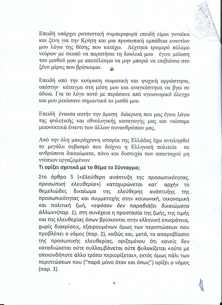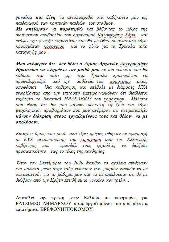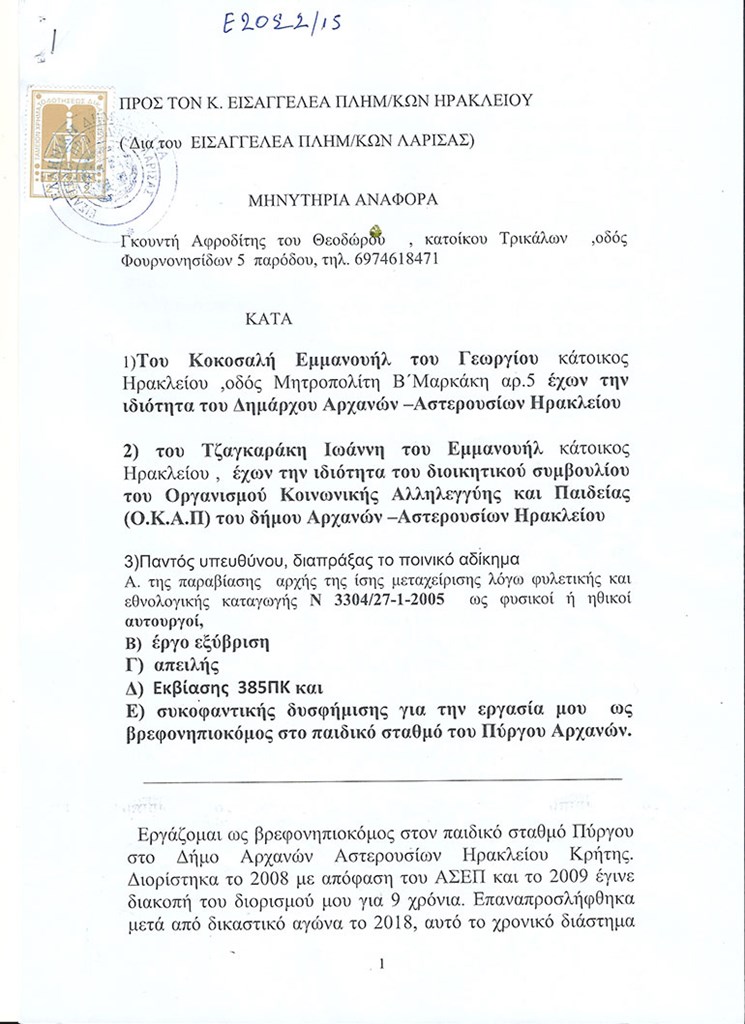 Για ρατσισμό καταγγέλλει η Αφροδίτη Γκουντή από τα Τρίκαλα τον δήμαρχο Αρχανών-Αστερουσίων Ηρακλείου Μανώλη Κοκοσαλή, καταθέτοντας μάλιστα μηνυτήρια αναφορά στην Εισαγγελία Λάρισας.