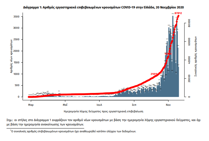 Τα στοιχεία που παρουσιάζονται αφορούν περιστατικά από την επιδημιολογική επιτήρηση της νόσου από το νέο κορωνοϊό (COVID19), με βάση τα δεδομένα που έχουν δηλωθεί στον ΕΟΔΥ και καταγραφεί μέχρι τις 20 Νοεμβρίου 2020 (ώρα 15:00). Τα νέα εργαστηριακά επιβεβαιωμένα κρούσματα της νόσου είναι 2581, εκ των οποίων 38 εντοπίστηκαν κατόπιν ελέγχων στις πύλες εισόδου της χώρας. Ο συνολικός αριθμός των κρουσμάτων ανέρχεται σε 87812 (ημερήσια μεταβολή +3.0%), εκ των οποίων 53.5% άνδρες. 1 Οι νέοι θάνατοι ασθενών με COVID-19 είναι 72, ενώ από την έναρξη της επιδημίας έχουν καταγραφεί συνολικά 1419 θάνατοι.Η διάμεση ηλικία των ασθενών που απεβίωσαν είναι 80 έτη. Ο αριθμός των ασθενών που νοσηλεύονται διασωληνωμένοι είναι 519 (69.9% άνδρες). Η ημερήσια κατανομή των επιβεβαιωμένων κρουσμάτων είναι η ακόλουθη (η γραμμή παριστάνει την συνολική, αθροιστική κατανομή των κρουσμάτων).