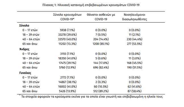 Τέλος, έχουμε 72 ακόμα καταγεγραμμένους θανάτους και 1419 θανάτους συνολικά στη χώρα. 573 (40.4%) γυναίκες και οι υπόλοιποι άνδρες. Η διάμεση ηλικία των θανόντων συμπολιτών μας ήταν τα 80 έτη και το 96.9% είχε κάποιο υποκείμενο νόσημα ή/και ηλικία 70 ετών και άνω.