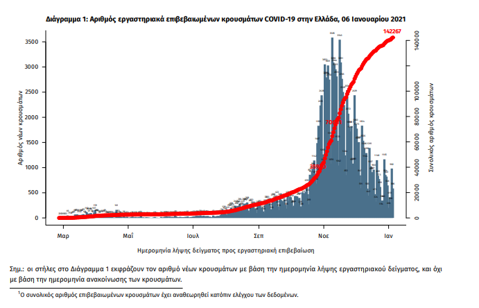 Τα στοιχεία που παρουσιάζονται αφορούν περιστατικά από την επιδημιολογική επιτήρηση της νόσου από το νέο κορωνοϊό (COVID19), με βάση τα δεδομένα που έχουν δηλωθεί στον ΕΟΔΥ και καταγραφεί μέχρι τις 06 Ιανουαρίου 2021 (ώρα 15:00). Τα νέα εργαστηριακά επιβεβαιωμένα κρούσματα της νόσου είναι 816, εκ των οποίων 24 εντοπίστηκαν κατόπιν ελέγχων στις πύλες εισόδου της χώρας. Ο συνολικός αριθμός των κρουσμάτων ανέρχεται σε 142267 (ημερήσια μεταβολή +0.6%), εκ των οποίων 52.3% άνδρες. 1 Οι νέοι θάνατοι ασθενών με COVID-19 είναι 48, ενώ από την έναρξη της επιδημίας έχουν καταγραφεί συνολικά 5099 θάνατοι.Η διάμεση ηλικία των ασθενών που απεβίωσαν είναι 79 έτη. Ο αριθμός των ασθενών που νοσηλεύονται διασωληνωμένοι είναι 399 (67.7% άνδρες). To για την επικράτεια εκτιμάται σε 0.75 (95%Crl: 0.16-1.40) Η ημερήσια κατανομή των επιβεβαιωμένων κρουσμάτων είναι η ακόλουθη (η γραμμή παριστάνει την συνολική, αθροιστική κατανομή των κρουσμάτων).