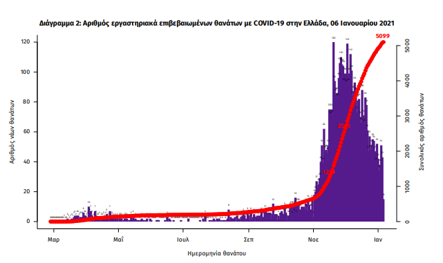 Τα στοιχεία που παρουσιάζονται αφορούν περιστατικά από την επιδημιολογική επιτήρηση της νόσου από το νέο κορωνοϊό (COVID19), με βάση τα δεδομένα που έχουν δηλωθεί στον ΕΟΔΥ και καταγραφεί μέχρι τις 06 Ιανουαρίου 2021 (ώρα 15:00). Τα νέα εργαστηριακά επιβεβαιωμένα κρούσματα της νόσου είναι 816, εκ των οποίων 24 εντοπίστηκαν κατόπιν ελέγχων στις πύλες εισόδου της χώρας. Ο συνολικός αριθμός των κρουσμάτων ανέρχεται σε 142267 (ημερήσια μεταβολή +0.6%), εκ των οποίων 52.3% άνδρες. 1 Οι νέοι θάνατοι ασθενών με COVID-19 είναι 48, ενώ από την έναρξη της επιδημίας έχουν καταγραφεί συνολικά 5099 θάνατοι.Η διάμεση ηλικία των ασθενών που απεβίωσαν είναι 79 έτη. Ο αριθμός των ασθενών που νοσηλεύονται διασωληνωμένοι είναι 399 (67.7% άνδρες). To για την επικράτεια εκτιμάται σε 0.75 (95%Crl: 0.16-1.40) Η ημερήσια κατανομή των επιβεβαιωμένων κρουσμάτων είναι η ακόλουθη (η γραμμή παριστάνει την συνολική, αθροιστική κατανομή των κρουσμάτων).
