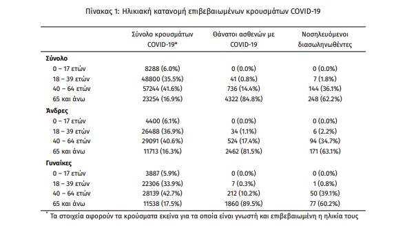 Η διάμεση ηλικία των κρουσμάτων είναι 44 έτη (εύρος 0.2 έως 104 ετών), ενώ η διάμεση ηλικία των θανάτων είναι 79 έτη (εύρος 24 έως 103 ετών). Η ηλικιακή κατανομή των (α) συνολικών κρουσμάτων, (β) των περιστατικών που κατέληξαν σε θάνατο και (γ) των ασθενών που νοσηλεύονται διασωληνωμένοι, είναι η ακόλουθη: