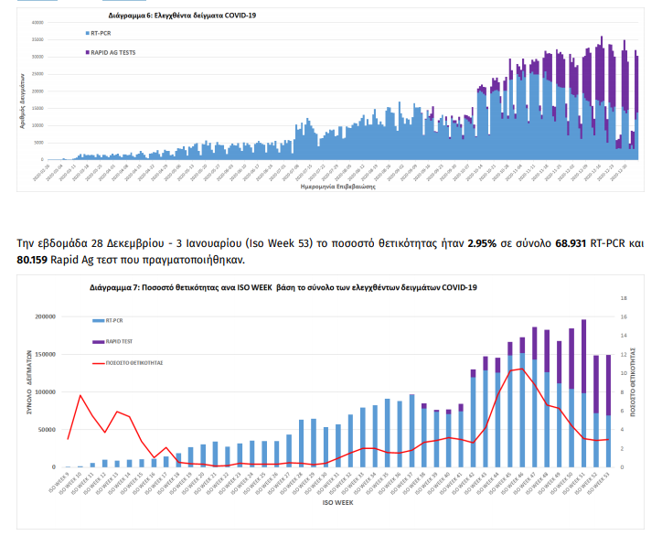 Δείγματα που έχουν ελεγχθεί: Από την 1η Ιανουαρίου 2020 μέχρι σήμερα, στα εργαστήρια που διενεργούν ελέγχους για τον νέο κορωνοϊό (SARS-CoV-2) και που δηλώνουν συστηματικά στον ΕΟΔΥ το σύνολο των δειγμάτων που ελέγχουν, έχουν συνολικά ελεγχθεί 2.854.159 κλινικά δείγματα ενώ από Μονάδες Υγείας και Κλιμάκια του ΕΟΔΥ που διενεργούν ελέγχους Rapid Ag έχουν ελεγχθεί 640.834 δείγματα