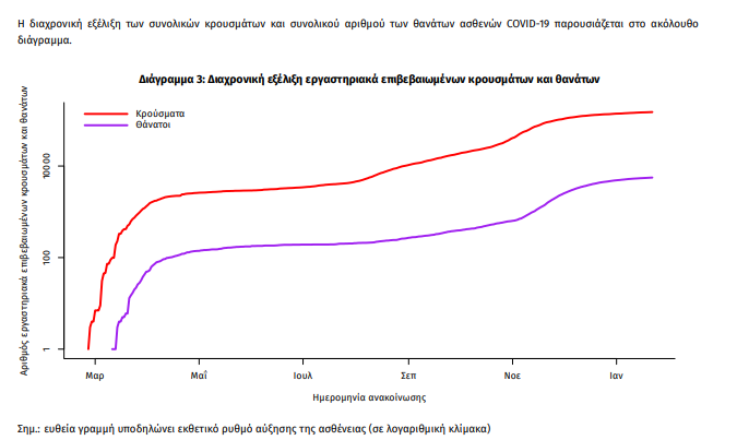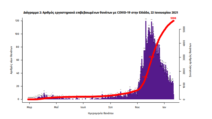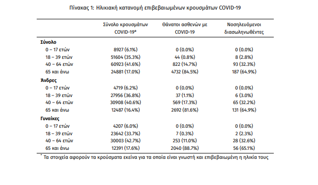 Τέλος, έχουμε 28 νέους θανάτους από τη νόσο COVID-19, φθάνοντας τους 5598 θανάτους συνολικά στη χώρα, εκ των οποίων 3302 (59.0%) άνδρες. Η διάμεση ηλικία των θανόντων συμπολιτών μας ήταν τα 79 έτη και το 95.4% είχε κάποιο υποκείμενο νόσημα ή/και ηλικία 70 ετών και άνω.