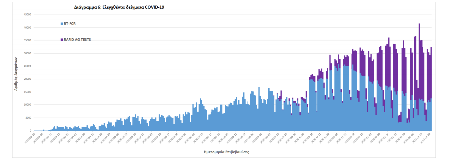 Δείγματα που έχουν ελεγχθεί: Από την 1η Ιανουαρίου 2020 μέχρι σήμερα, στα εργαστήρια που διενεργούν ελέγχους για τον νέο κορωνοϊό (SARS-CoV-2) και που δηλώνουν συστηματικά στον ΕΟΔΥ το σύνολο των δειγμάτων που ελέγχουν, έχουν συνολικά ελεγχθεί 3.012.892 κλινικά δείγματα ενώ από Μονάδες Υγείας και Κλιμάκια του ΕΟΔΥ που διενεργούν ελέγχους Rapid Ag έχουν ελεγχθεί 917.739 δείγματα.