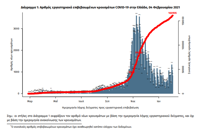 Τα στοιχεία που παρουσιάζονται αφορούν περιστατικά από την επιδημιολογική επιτήρηση της νόσου από το νέο κορωνοϊό (COVID19), με βάση τα δεδομένα που έχουν δηλωθεί στον ΕΟΔΥ και καταγραφεί μέχρι τις 04 Φεβρουαρίου 2021 (ώρα 15:00). Τα νέα εργαστηριακά επιβεβαιωμένα κρούσματα της νόσου είναι 1070, εκ των οποίων 1 εντοπίστηκε κατόπιν ελέγχων στις πύλες εισόδου της χώρας. Ο συνολικός αριθμός των κρουσμάτων ανέρχεται σε 160935 (ημερήσια μεταβολή +0.7%), εκ των οποίων 51.9% άνδρες. 1 Οι νέοι θάνατοι ασθενών με COVID-19 είναι 25, ενώ από την έναρξη της επιδημίας έχουν καταγραφεί συνολικά 5903 θάνατοι. Η διάμεση ηλικία των ασθενών που απεβίωσαν είναι 79 έτη. Ο αριθμός των ασθενών που νοσηλεύονται διασωληνωμένοι είναι 249 (71.9% άνδρες). Η ημερήσια κατανομή των επιβεβαιωμένων κρουσμάτων είναι η ακόλουθη (η γραμμή παριστάνει την συνολική, αθροιστική κατανομή των κρουσμάτων).