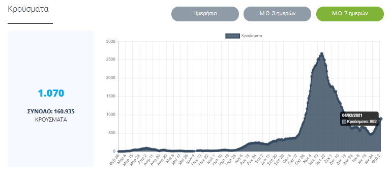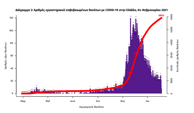 Τα στοιχεία που παρουσιάζονται αφορούν περιστατικά από την επιδημιολογική επιτήρηση της νόσου από το νέο κορωνοϊό (COVID19), με βάση τα δεδομένα που έχουν δηλωθεί στον ΕΟΔΥ και καταγραφεί μέχρι τις 04 Φεβρουαρίου 2021 (ώρα 15:00). Τα νέα εργαστηριακά επιβεβαιωμένα κρούσματα της νόσου είναι 1070, εκ των οποίων 1 εντοπίστηκε κατόπιν ελέγχων στις πύλες εισόδου της χώρας. Ο συνολικός αριθμός των κρουσμάτων ανέρχεται σε 160935 (ημερήσια μεταβολή +0.7%), εκ των οποίων 51.9% άνδρες. 1 Οι νέοι θάνατοι ασθενών με COVID-19 είναι 25, ενώ από την έναρξη της επιδημίας έχουν καταγραφεί συνολικά 5903 θάνατοι. Η διάμεση ηλικία των ασθενών που απεβίωσαν είναι 79 έτη. Ο αριθμός των ασθενών που νοσηλεύονται διασωληνωμένοι είναι 249 (71.9% άνδρες). Η ημερήσια κατανομή των επιβεβαιωμένων κρουσμάτων είναι η ακόλουθη (η γραμμή παριστάνει την συνολική, αθροιστική κατανομή των κρουσμάτων).