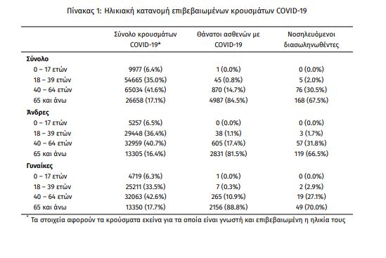 Η διάμεση ηλικία των κρουσμάτων είναι 44 έτη (εύρος 0.2 έως 105 έτη), ενώ η διάμεση ηλικία των θανάτων είναι 79 έτη (εύρος 15 έως 103 έτη). Η ηλικιακή κατανομή των (α) συνολικών κρουσμάτων, (β) των περιστατικών που κατέληξαν σε θάνατο και (γ) των ασθενών που νοσηλεύονται διασωληνωμένοι, είναι η ακόλουθη:
