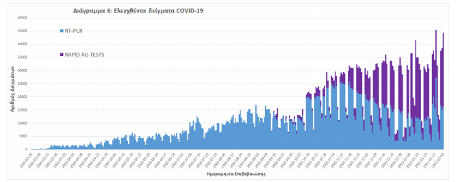 Δείγματα που έχουν ελεγχθεί: Από την 1η Ιανουαρίου 2020 μέχρι σήμερα, στα εργαστήρια που διενεργούν ελέγχους για τον νέο κορωνοϊό (SARS-CoV-2) και που δηλώνουν συστηματικά στον ΕΟΔΥ το σύνολο των δειγμάτων που ελέγχουν, έχουν συνολικά ελεγχθεί 3.185.847 κλινικά δείγματα ενώ από Μονάδες Υγείας και Κλιμάκια του ΕΟΔΥ που διενεργούν ελέγχους Rapid Ag έχουν ελεγχθεί 1.127.502 δείγματα.