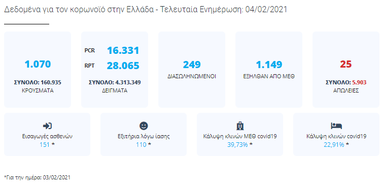 Σήμερα, Πέμπτη 4 Φεβρουαρίου, ο Εθνικός Οργανισμός Δημόσιας Υγείας ανακοίνωσε 1.070 νέα κρούσματα Covid-19 στην Ελλάδα, αριθμός μικρότερος από τα 1.151 που καταγράφηκαν την προηγούμενη ημέρα. Σημειώνεται πως πρόκειται για την τρίτη κατά σειρά ημέρα που οι περιπτώσεις του ιού που επιβεβαιώθηκαν σε ένα 24ωρο ξεπερνούν τις 1.000.