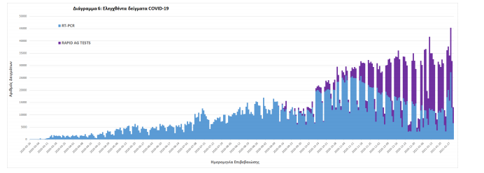 Δείγματα που έχουν ελεγχθεί: Από την 1η Ιανουαρίου 2020 μέχρι σήμερα, στα εργαστήρια που διενεργούν ελέγχους για τον νέο κορωνοϊό (SARS-CoV-2) και που δηλώνουν συστηματικά στον ΕΟΔΥ το σύνολο των δειγμάτων που ελέγχουν, έχουν συνολικά ελεγχθεί 3.133.965 κλινικά δείγματα ενώ από Μονάδες Υγείας και Κλιμάκια του ΕΟΔΥ που διενεργούν ελέγχους Rapid Ag έχουν ελεγχθεί 1.047.350 δείγματα.