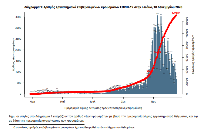 Τα στοιχεία που παρουσιάζονται αφορούν περιστατικά από την επιδημιολογική επιτήρηση της νόσου από το νέο κορωνοϊό (COVID19), με βάση τα δεδομένα που έχουν δηλωθεί στον ΕΟΔΥ και καταγραφεί μέχρι τις 18 Δεκεμβρίου 2020 (ώρα 15:00). Τα νέα εργαστηριακά επιβεβαιωμένα κρούσματα της νόσου είναι 916, εκ των οποίων 8 εντοπίστηκαν κατόπιν ελέγχων στις πύλες εισόδου της χώρας. Ο συνολικός αριθμός των κρουσμάτων ανέρχεται σε 129584 (ημερήσια μεταβολή +0.7%), εκ των οποίων 52.5% άνδρες. 1 Οι νέοι θάνατοι ασθενών με COVID-19 είναι 96, ενώ από την έναρξη της επιδημίας έχουν καταγραφεί συνολικά 4044 θάνατοι.Η διάμεση ηλικία των ασθενών που απεβίωσαν είναι 79 έτη. Ο αριθμός των ασθενών που νοσηλεύονται διασωληνωμένοι είναι 527 (69.6% άνδρες). Η ημερήσια κατανομή των επιβεβαιωμένων κρουσμάτων είναι η ακόλουθη (η γραμμή παριστάνει την συνολική, αθροιστική κατανομή των κρουσμάτων).