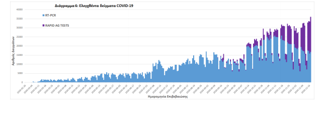 Δείγματα που έχουν ελεγχθεί: Από την 1η Ιανουαρίου 2020 μέχρι σήμερα, στα εργαστήρια που διενεργούν ελέγχους για τον νέο κορωνοϊό (SARS-CoV-2) και που δηλώνουν συστηματικά στον ΕΟΔΥ το σύνολο των δειγμάτων που ελέγχουν, έχουν συνολικά ελεγχθεί 2.657.007 κλινικά δείγματα ενώ από Μονάδες Υγείας και Κλιμάκια του ΕΟΔΥ που διενεργούν ελέγχους Rapid Ag έχουν ελεγχθεί 418.065 δείγματα.