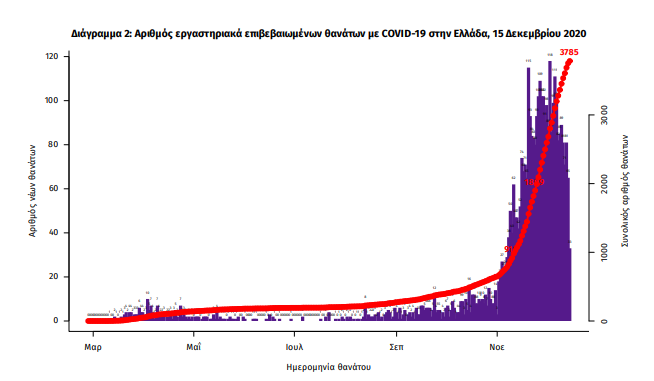 Τα στοιχεία που παρουσιάζονται αφορούν περιστατικά από την επιδημιολογική επιτήρηση της νόσου από το νέο κορωνοϊό (COVID19), με βάση τα δεδομένα που έχουν δηλωθεί στον ΕΟΔΥ και καταγραφεί μέχρι τις 15 Δεκεμβρίου 2020 (ώρα 15:00). Τα νέα εργαστηριακά επιβεβαιωμένα κρούσματα της νόσου είναι 1240, εκ των οποίων 14 εντοπίστηκαν κατόπιν ελέγχων στις πύλες εισόδου της χώρας. Ο συνολικός αριθμός των κρουσμάτων ανέρχεται σε 126372 (ημερήσια μεταβολή +1.0%), εκ των οποίων 52.5% άνδρες. 1 Οι νέοι θάνατοι ασθενών με COVID-19 είναι 98, ενώ από την έναρξη της επιδημίας έχουν καταγραφεί συνολικά 3785 θάνατοι.Η διάμεση ηλικία των ασθενών που απεβίωσαν είναι 79 έτη. Ο αριθμός των ασθενών που νοσηλεύονται διασωληνωμένοι είναι 550 (69.8% άνδρες). Η ημερήσια κατανομή των επιβεβαιωμένων κρουσμάτων είναι η ακόλουθη (η γραμμή παριστάνει την συνολική, αθροιστική κατανομή των κρουσμάτων).