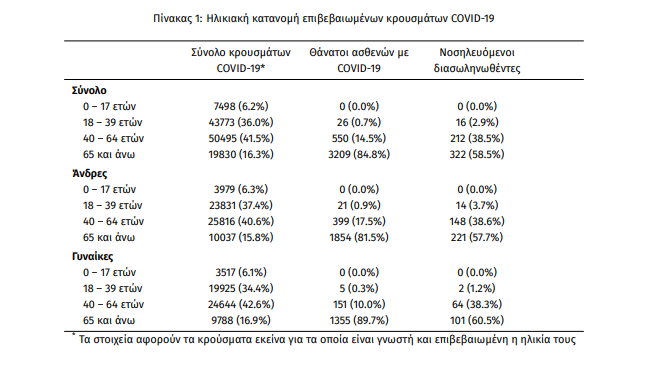 Τέλος, έχουμε 98 ακόμα καταγεγραμμένους θανάτους και 3785 θανάτους συνολικά στη χώρα. 1512 (39.9%) γυναίκες και οι υπόλοιποι άνδρες. Η διάμεση ηλικία των θανόντων συμπολιτών μας ήταν τα 79 έτη και το 95.6% είχε κάποιο υποκείμενο νόσημα ή/και ηλικία 70 ετών και άνω.