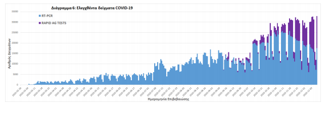 Δείγματα που έχουν ελεγχθεί: Από την 1η Ιανουαρίου 2020 μέχρι σήμερα, στα εργαστήρια που διενεργούν ελέγχους για τον νέο κορωνοϊό (SARS-CoV-2) και που δηλώνουν συστηματικά στον ΕΟΔΥ το σύνολο των δειγμάτων που ελέγχουν, έχουν συνολικά ελεγχθεί 2607015 κλινικά δείγματα ενώ από Μονάδες Υγείας και Κλιμάκια του ΕΟΔΥ που διενεργούν ελέγχους Rapid Ag έχουν ελεγχθεί 364737 δείγματα.