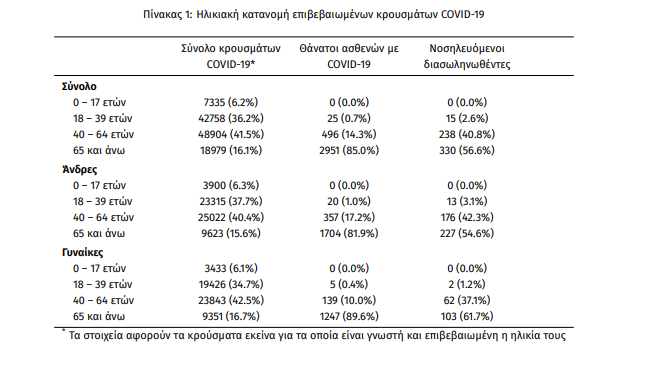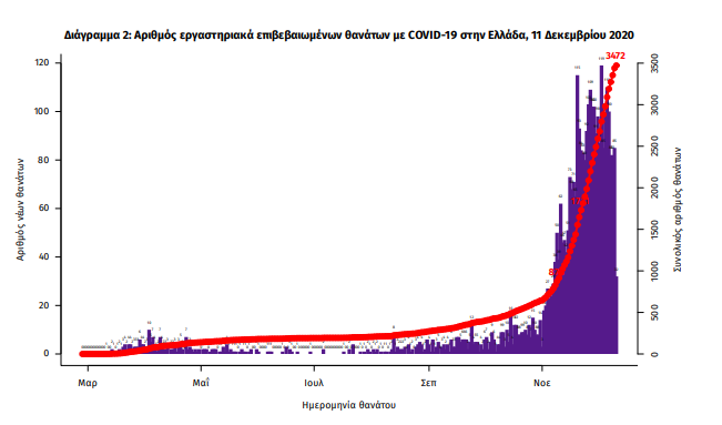 Τέλος, έχουμε 102 ακόμα καταγεγραμμένους θανάτους και 3472 θανάτους συνολικά στη χώρα. 1392 (40.1%) γυναίκες και οι υπόλοιποι άνδρες. Η διάμεση ηλικία των θανόντων συμπολιτών μας ήταν τα 79 έτη και το 96.0% είχε κάποιο υποκείμενο νόσημα ή/και ηλικία 70 ετών και άνω.