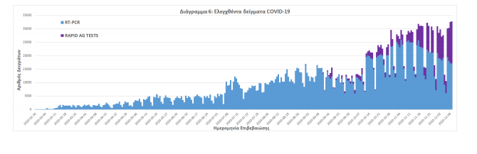 Δείγματα που έχουν ελεγχθεί: Από την 1η Ιανουαρίου 2020 μέχρι σήμερα, στα εργαστήρια που διενεργούν ελέγχους για τον νέο κορωνοϊό (SARS-CoV-2) και που δηλώνουν συστηματικά στον ΕΟΔΥ το σύνολο των δειγμάτων που ελέγχουν, έχουν συνολικά ελεγχθεί 2557145 κλινικά δείγματα ενώ από Μονάδες Υγείας και Κλιμάκια του ΕΟΔΥ που διενεργούν ελέγχους Rapid Ag έχουν ελεγχθεί 322615 δείγματα.