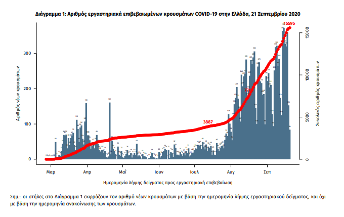 Τα στοιχεία που παρουσιάζονται αφορούν περιστατικά από την επιδημιολογική επιτήρηση της νόσου από το νέο κορωνοϊό (COVID19), με βάση τα δεδομένα που έχουν δηλωθεί στον ΕΟΔΥ και καταγραφεί μέχρι τις 21 Σεπτεμβρίου 2020 (ώρα 15:00). Τα νέα εργαστηριακά επιβεβαιωμένα κρούσματα της νόσου είναι 453, εκ των οποίων 195 συνδέονται με γνωστές συρροές (τα 184 στο ΚΥΤ Καρά Τεπέ Λέσβου) και 25 εντοπίστηκαν κατόπιν ελέγχων στις πύλες εισόδου της χώρας. Ο συνολικός αριθμός των κρουσμάτων ανέρχεται σε 15595 (ημερήσια μεταβολή +3.0%), εκ των οποίων 55.8% άνδρες. Οι νέοι θάνατοι ασθενών με COVID-19 είναι 6, ενώ από την έναρξη της επιδημίας έχουν καταγραφεί συνολικά 344 θάνατοι. Η διάμεση ηλικία των ασθενών που απεβίωσαν είναι 78 έτη. Ο αριθμός των ασθενών που νοσηλεύονται διασωληνωμένοι είναι 79 (69.6% άνδρες). Η ημερήσια κατανομή των επιβεβαιωμένων κρουσμάτων είναι η ακόλουθη (η γραμμή παριστάνει την συνολική, αθροιστική κατανομή των κρουσμάτων).