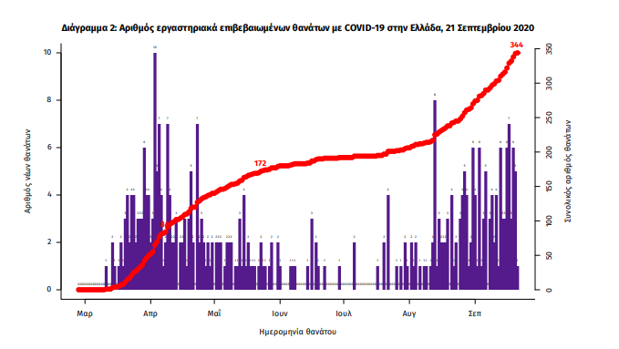 Τέλος, έχουμε 6 ακόμα καταγεγραμμένους θανάτους και 344 θανάτους συνολικά στη χώρα. 128 (37.2%) γυναίκες και οι υπόλοιποι άνδρες. Η διάμεση ηλικία των θανόντων συμπολιτών μας ήταν τα 78 έτη και το 96.8% είχε κάποιο υποκείμενο νόσημα ή/και ηλικία 70 ετών και άνω.