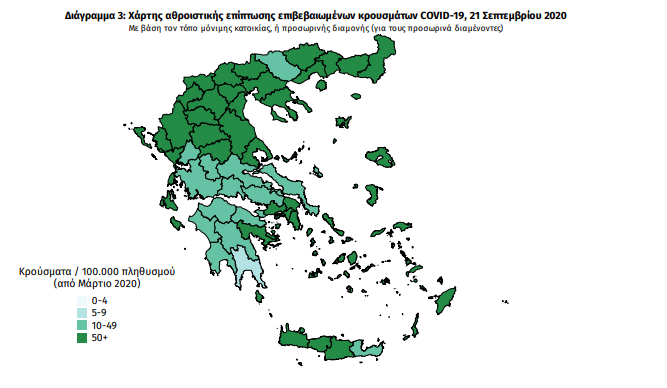 Τα στοιχεία που παρουσιάζονται αφορούν περιστατικά από την επιδημιολογική επιτήρηση της νόσου από το νέο κορωνοϊό (COVID19), με βάση τα δεδομένα που έχουν δηλωθεί στον ΕΟΔΥ και καταγραφεί μέχρι τις 21 Σεπτεμβρίου 2020 (ώρα 15:00). Τα νέα εργαστηριακά επιβεβαιωμένα κρούσματα της νόσου είναι 453, εκ των οποίων 195 συνδέονται με γνωστές συρροές (τα 184 στο ΚΥΤ Καρά Τεπέ Λέσβου) και 25 εντοπίστηκαν κατόπιν ελέγχων στις πύλες εισόδου της χώρας. Ο συνολικός αριθμός των κρουσμάτων ανέρχεται σε 15595 (ημερήσια μεταβολή +3.0%), εκ των οποίων 55.8% άνδρες. Οι νέοι θάνατοι ασθενών με COVID-19 είναι 6, ενώ από την έναρξη της επιδημίας έχουν καταγραφεί συνολικά 344 θάνατοι. Η διάμεση ηλικία των ασθενών που απεβίωσαν είναι 78 έτη. Ο αριθμός των ασθενών που νοσηλεύονται διασωληνωμένοι είναι 79 (69.6% άνδρες). Η ημερήσια κατανομή των επιβεβαιωμένων κρουσμάτων είναι η ακόλουθη (η γραμμή παριστάνει την συνολική, αθροιστική κατανομή των κρουσμάτων).