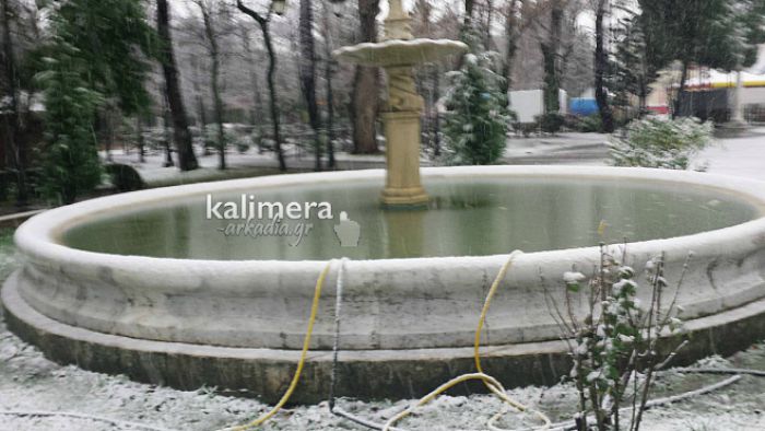 Η πυκνή χιονόπτωση, σε συνδυασμό με τις πολύ χαμηλές θερμοκρασίες, πάγωσαν τα νερά στο σιντριβάνι στην πλατεία Άρεως. Το σιντριβάνι είχε … κρυσταλλώσει και όλα ήταν παγωμένα!