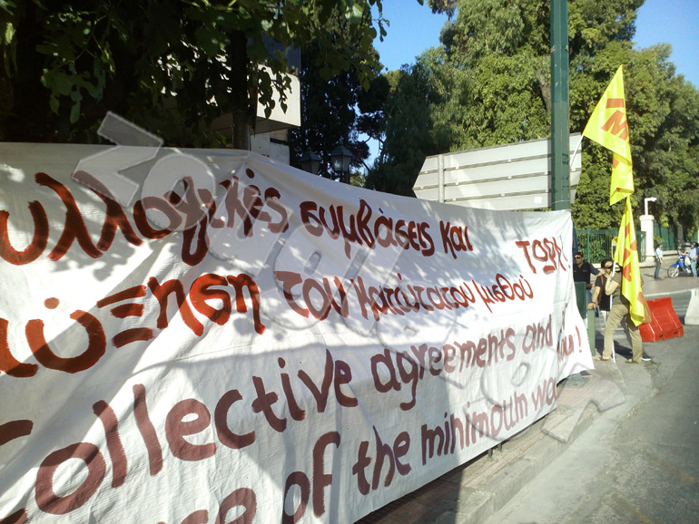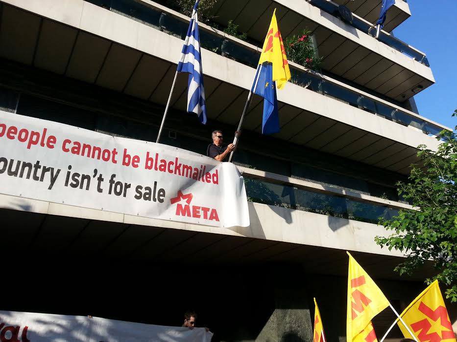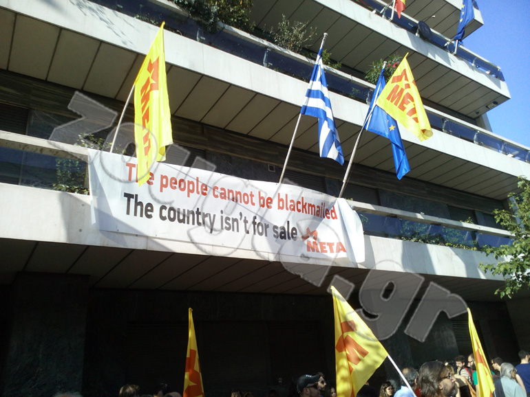 – το δεύτερο, «The people cannot be blackmailed – The country isn’t for sale», αναρτήθηκε στον πρώτο όροφο των γραφείων της Κομισιόν στην Ελλάδα, αφού πρώτα οι συνδικαλιστές του ΜΕΤΑ ανέβηκαν από τη σκοπιά που αστυνομικού φρουρού που υπάρχει στο σημείο, στο μπαλκόνι του ορόφου.»