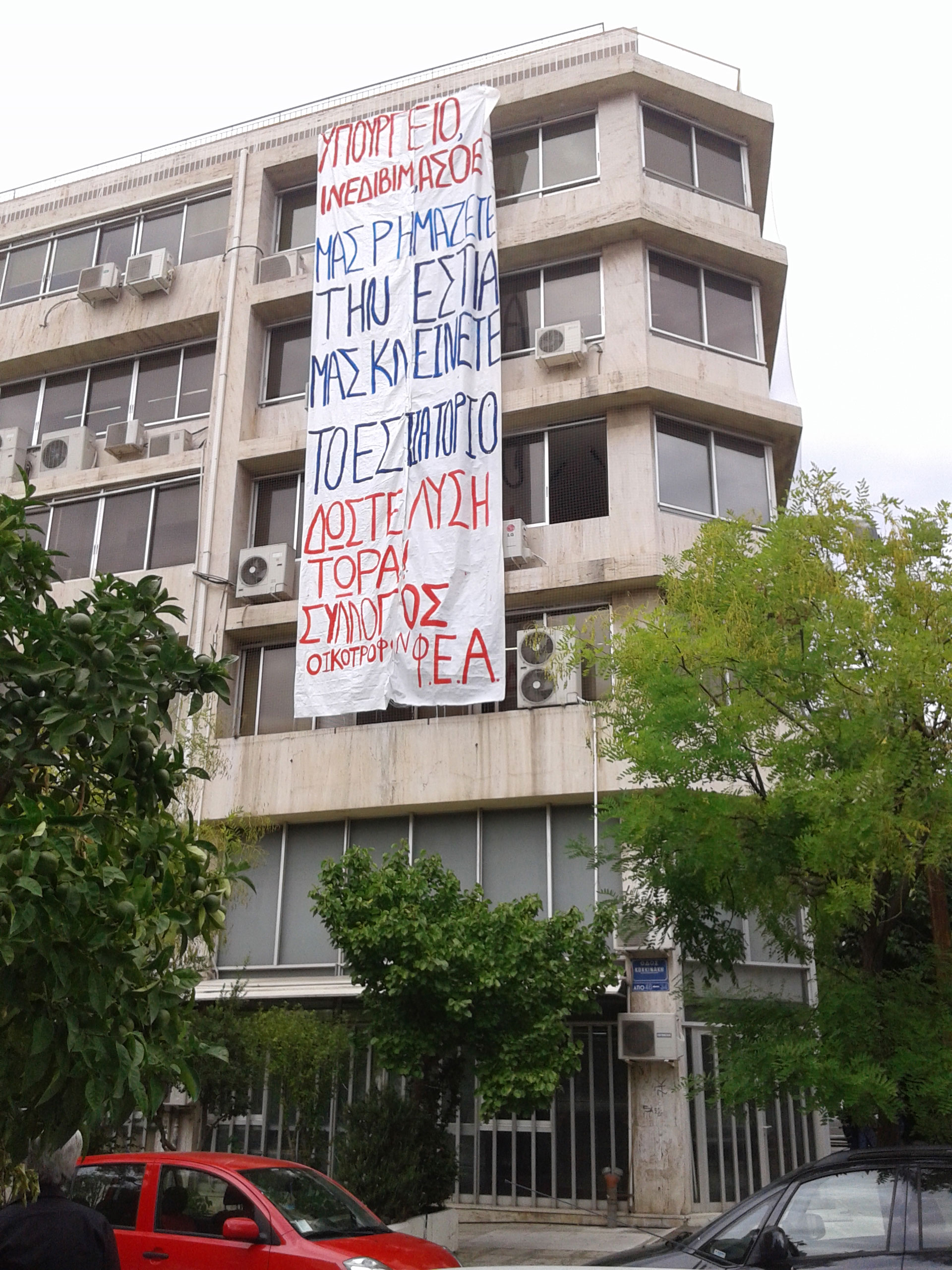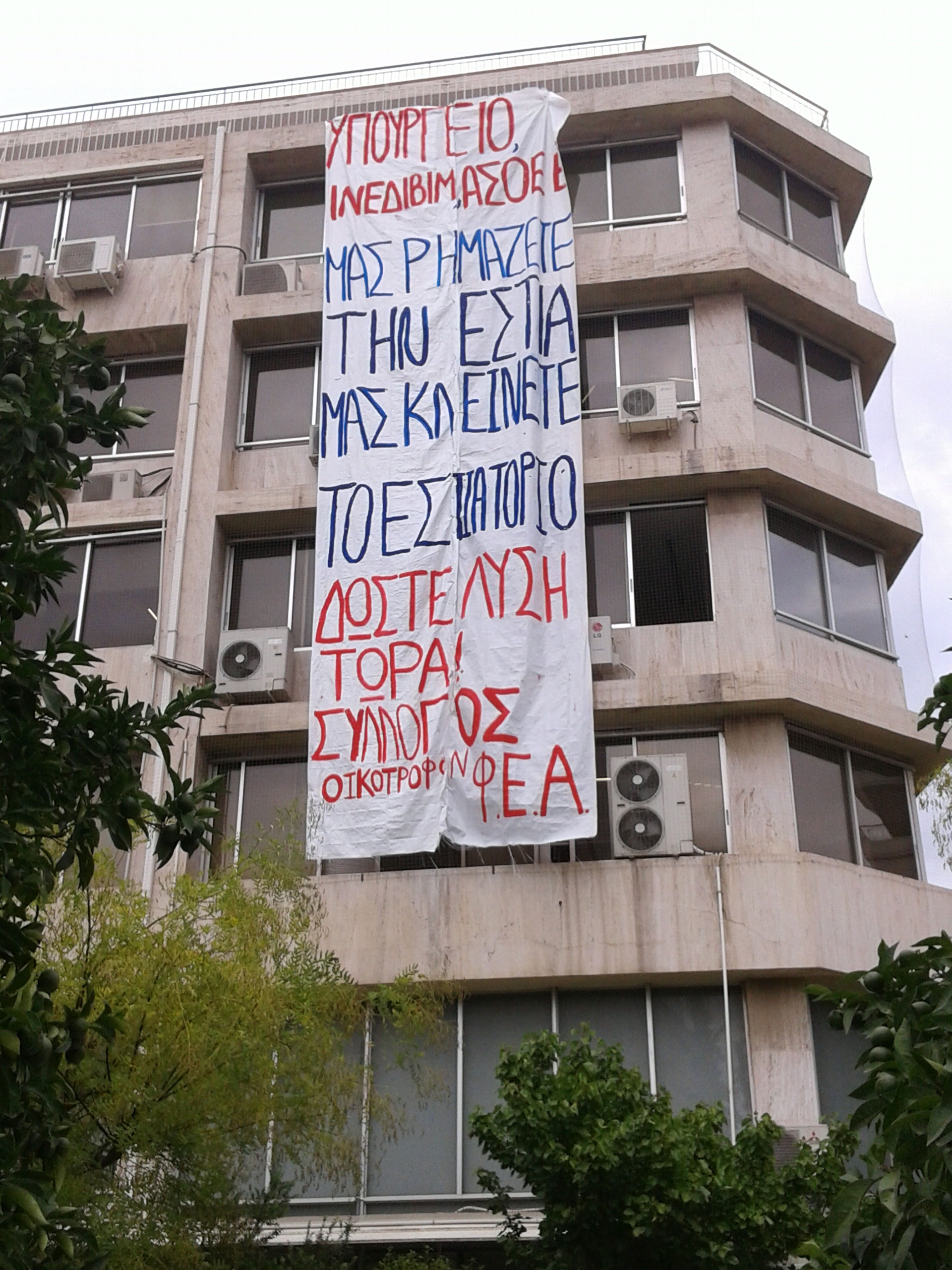 Στο κτήριο ο Σύλλογος Οικοτρόφων της ΦΕΑ έχει αναρτήσει πανό που αναγράφει «Υπουργείο, ΙΝΕΔΙΒΙΜ, ΑΣΟΕΕ μας ρημάζετε την εστία, μας κλείνετε το εστιατόριο! Δώστε λύση τώρα».