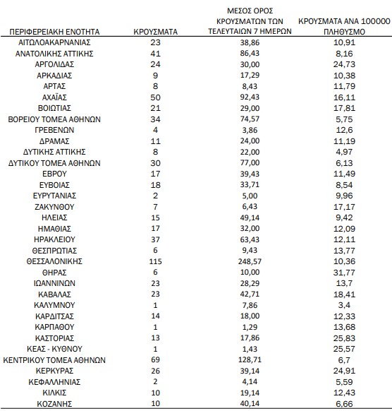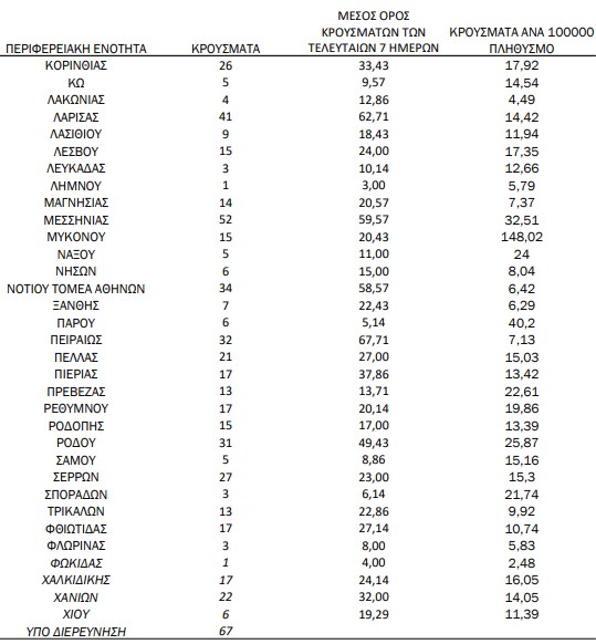 Τα νέα εργαστηριακά επιβεβαιωμένα κρούσματα της νόσου που καταγράφηκαν τις τελευταίες 24 ώρες είναι 1.291, εκ των οποίων 22 εντοπίστηκαν κατόπιν ελέγχων στις πύλες εισόδου της χώρας. Ο συνολικός αριθμός των κρουσμάτων ανέρχεται σε 599.951 (ημερήσια μεταβολή +0.2%), εκ των οποίων 51.0% άνδρες. Με βάση τα επιβεβαιωμένα κρούσματα των τελευταίων 7 ημερών, 155 θεωρούνται σχετιζόμενα με ταξίδι από το εξωτερικό και 1.591 είναι σχετιζόμενα με ήδη γνωστό κρούσμα.