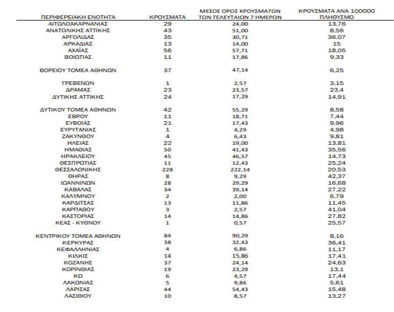 Τα νέα εργαστηριακά επιβεβαιωμένα κρούσματα της νόσου που καταγράφηκαν τις τελευταίες 24 ώρες είναι 1.608 , εκ των οποίων 5 εντοπίστηκαν κατόπιν ελέγχων στις πύλες εισόδου της χώρας. Ο συνολικός αριθμός των κρουσμάτων ανέρχεται σε 616.765 (ημερήσια μεταβολή +0.3%), εκ των οποίων 51.0% άνδρες. Με βάση τα επιβεβαιωμένα κρούσματα των τελευταίων 7 ημερών, 151 θεωρούνται σχετιζόμενα με ταξίδι από το εξωτερικό και 2.595 είναι σχετιζόμενα με ήδη γνωστό κρούσμα.