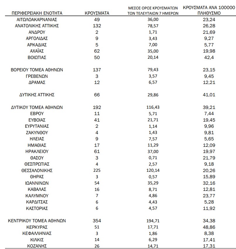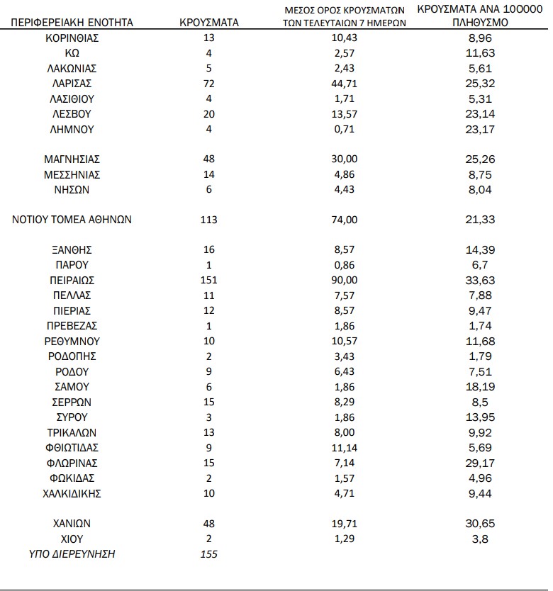 «Τα νέα εργαστηριακά επιβεβαιωμένα κρούσματα της νόσου που καταγράφηκαν τις τελευταίες 24 ώρες είναι 2.433, εκ των οποίων 3 εντοπίστηκαν κατόπιν ελέγχων στις πύλες εισόδου της χώρας. Ο συνολικός αριθμός των κρουσμάτων ανέρχεται σε 393.583 (ημερήσια μεταβολή +0.6%), εκ των οποίων 51.2% άνδρες. 1 Με βάση τα επιβεβαιωμένα κρούσματα των τελευταίων 7 ημερών, 30 θεωρούνται σχετιζόμενα με ταξίδι από το εξωτερικό και 1.997 είναι σχετιζόμενα με ήδη γνωστό κρούσμα.