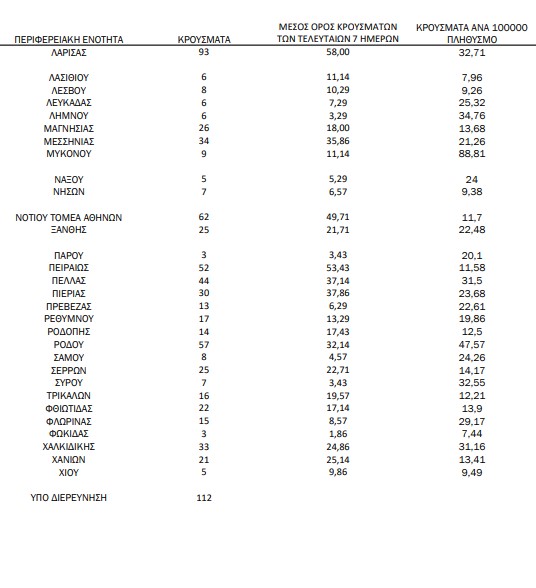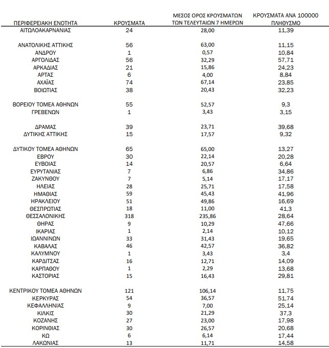 Τα νέα εργαστηριακά επιβεβαιωμένα κρούσματα της νόσου που καταγράφηκαν τις τελευταίες 24 ώρες είναι 2.197, εκ των οποίων 15 εντοπίστηκαν κατόπιν ελέγχων στις πύλες εισόδου της χώρας. Ο συνολικός αριθμός των κρουσμάτων ανέρχεται σε 613.838 (ημερήσια μεταβολή +0.4%), εκ των οποίων 51.0% άνδρες. Με βάση τα επιβεβαιωμένα κρούσματα των τελευταίων 7 ημερών, 186 θεωρούνται σχετιζόμενα με ταξίδι από το εξωτερικό και 2.801 είναι σχετιζόμενα με ήδη γνωστό κρούσμα.