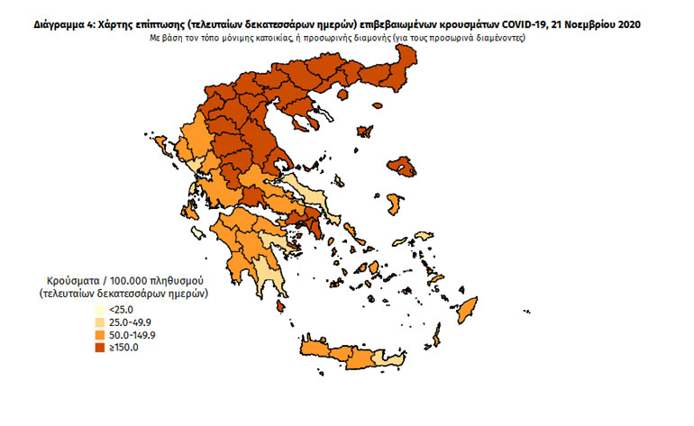 Ο χάρτης αποτυπώνει τη γεωγραφική κατανομή των συνολικών κρουσμάτων COVID-19 (από την αρχή της επιδημίας) ανά Περιφερειακή Ενότητα της χώρας, με βάση την δηλωθείσα διεύθυνση μόνιμης κατοικίας του ασθενούς, ή τη διεύθυνση προσωρινής διαμονής για τους τουρίστες και άλλους προσωρινά διαμένοντες στην Ελλάδα. Συμπεριλαμβάνονται τόσο κρούσματα με ιστορικό ταξιδίου (“εισαγόμενα”) όσο και κρούσματα με πιθανή εγχώρια μετάδοση.