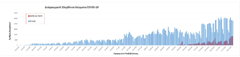 Δείγματα που έχουν ελεγχθεί:Από την 1η Ιανουαρίου 2020 μέχρι σήμερα, στα εργαστήρια που διενεργούν ελέγχους για τον νέο κορωνοϊό (SARS-CoV-2) και που δηλώνουν συστηματικά στον ΕΟΔΥ το σύνολο των δειγμάτων που ελέγχουν, έχουν συνολικά ελεγχθεί 2.223.225 κλινικά δείγματα ενώ από Μονάδες Υγείας και Κλιμάκια του ΕΟΔΥ που διενεργούν ελέγχους Rapid έχουν ελεγχθεί 1.493.59 δείγματα.